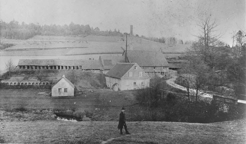 Das Bild zeigt die Pumpenfabrik und darüber die Ziegelei etwa um 1900. Heute befinden sich dort die