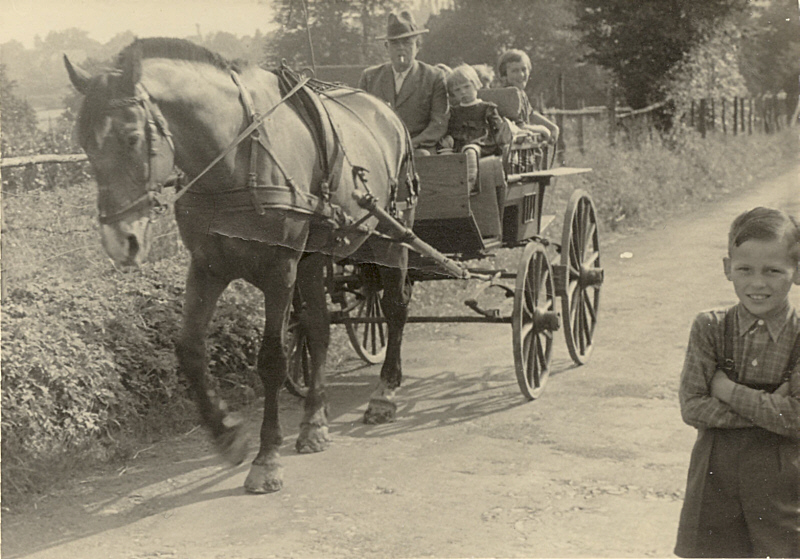 Bäckermeister Otto Pattberg fährt mit Enkelin und anderen Kindern aus dem Dorf auf der Linger Straße