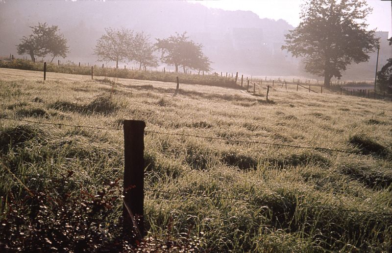 Das Bild zeigt die Obstwiese östlich von Oberwipper bei Sonnenaufgang im Sommer 1974, kurz nachdem